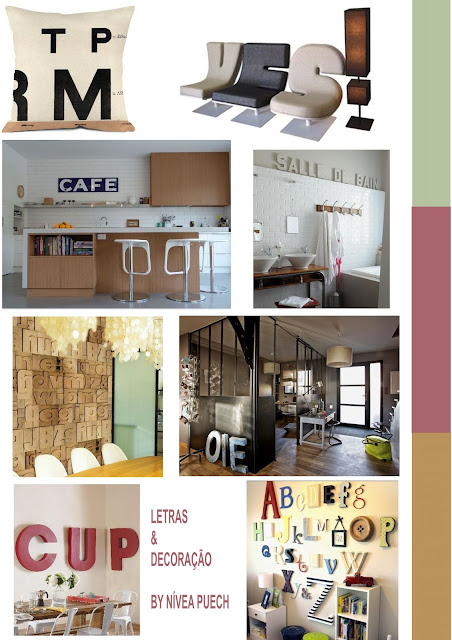 Olá pessoal, as letras saem do papel e invadem os tecidos da moda e estão cada vez mais presentes na decoração, nos mais diferentes materiais: madeira, adesivos, papel marchê entre outros. Que tal, observar estas dicas e se inspirar para fazer o mesmo na sua casa? Você pode fazer uma decoração bem divertida!