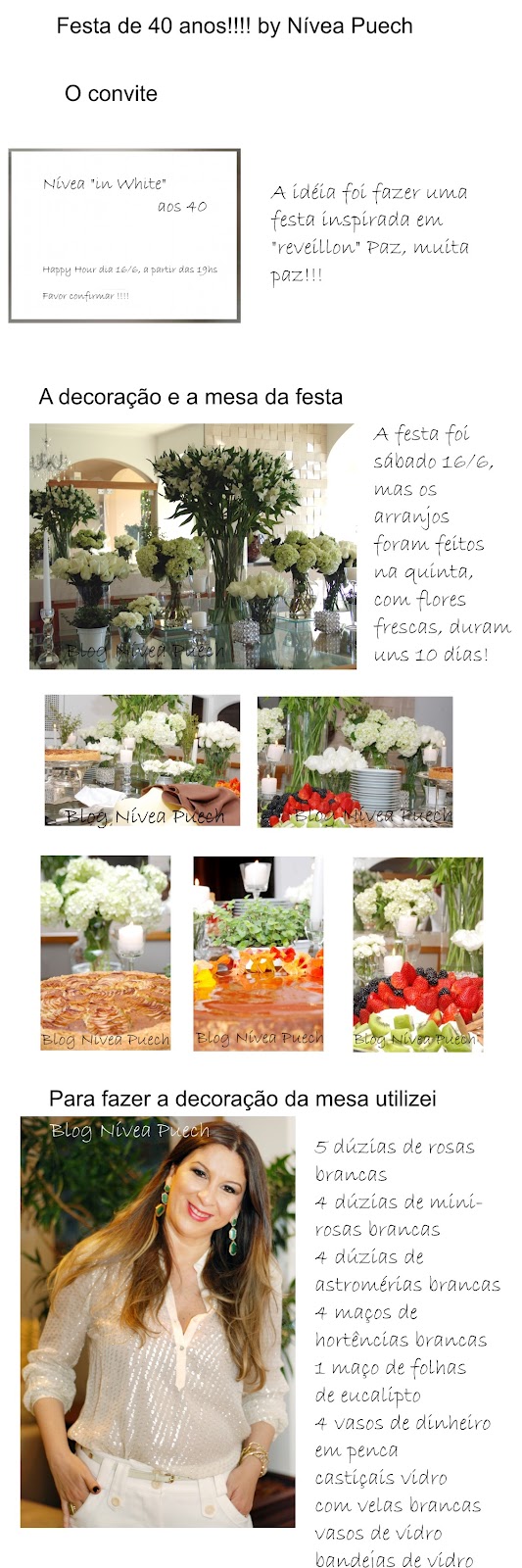 Oi pessoal, tudo bem? Já faz um tempinho que eu não escrevo, mas eu quero compartilhar com vocês a minha festa de 40 anos, que foi comemorado no dia 16/6! Foi muito emocionante e eu fiquei bastante feliz. Sempre quis festejar todos os meus aniversários, mas este teve um sabor especial! Amigos que eu não via há algum tempo foram e havia muita gente querida! Afinal, o que vale a vida da gente, senão por esses momentos alegres e cheios de afeto!!! Por isso eu planejei com bastante carinho a festa, desde o convite até os últimos detalhezinhos…A festa foi com o tema “White” e eu quis transmitir toda a sensação de paz e alegria que estou vivendo, a decoração foi toda com flores brancas e eu, claro também estava de branco!